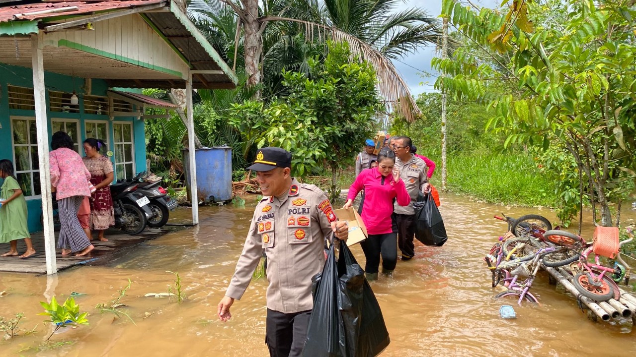 Di tengah kepungan banjir yang melanda pemukiman warga, Kapolsek Kuala Mandor B, IPDA Achmad Al Ghazali, memilih turun langsung ke lapangan. Didampingi Ketua Ranting Bhayangkari Ny. Nadya Al Ghazali serta personel Polsek Kuala Mandor B, ia melakukan monitoring situasi banjir di Dusun Jaya Sakti, yang berdampak pada tiga RT.